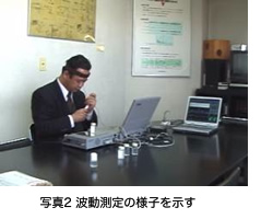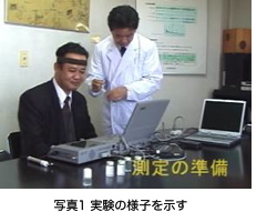 写真2に波動測定中の脳波観察の様子をしめす。4種類のサンプルと、リファレンスサンプルとしてサンプルNo.102と同じものを用意して感覚を調整してもらった。他のサンプルはランダムにブラインドで手渡し波動値の測定を行った。このようなテスト法では完全なブラインドとは言えないが、ある程度許容されるものと考える。