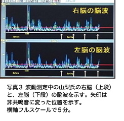 写真3に、パソコンのディスプレー上に表示された山梨氏の右脳(上段)と左脳(下段)の脳波を示す。横軸は時間で、左部分の1分間は目を閉じて心静かに過ごしている状態。続く5分間は波動を測定しているときの脳波をします。縦軸は電圧値で最大80μV。グラフはθ波が青、α波は緑、β波がピンク色で表示される。